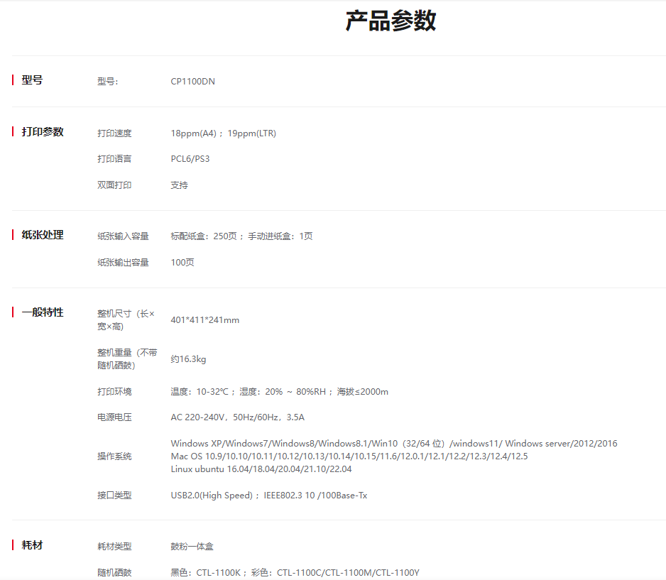 耗材型号  :   黑色:CTL-1100K ;彩色:CTL-1100C/CTL-1100M/CTL-1100Y